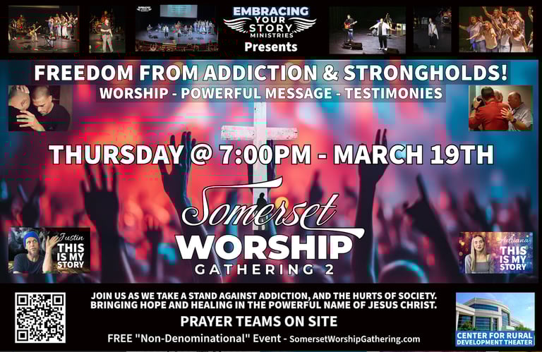 Somerset Worship Gathering 2 is set for Thursday March 19th 2026 at the Center For Rural Development Theater! This is a FREE (Non Denominational) event. A night of powerful worship with a focus on freedom from addiction, emotional strongholds and physical healing. God's desires YOUR restoration! Everyone is Welcome!