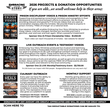 FINANCIAL - While we are fully confident that "Where HE guides...He provides"...we also understand that God loves unity and uses His kids to help support others in their callings. We are "all in" and your monthly support or one-time gift greatly helps us with the growing ministry requirements of Embracing Your Story Ministries. We honor your gifts and use them wisely! Thank you standing with us in carrying out the gospel.