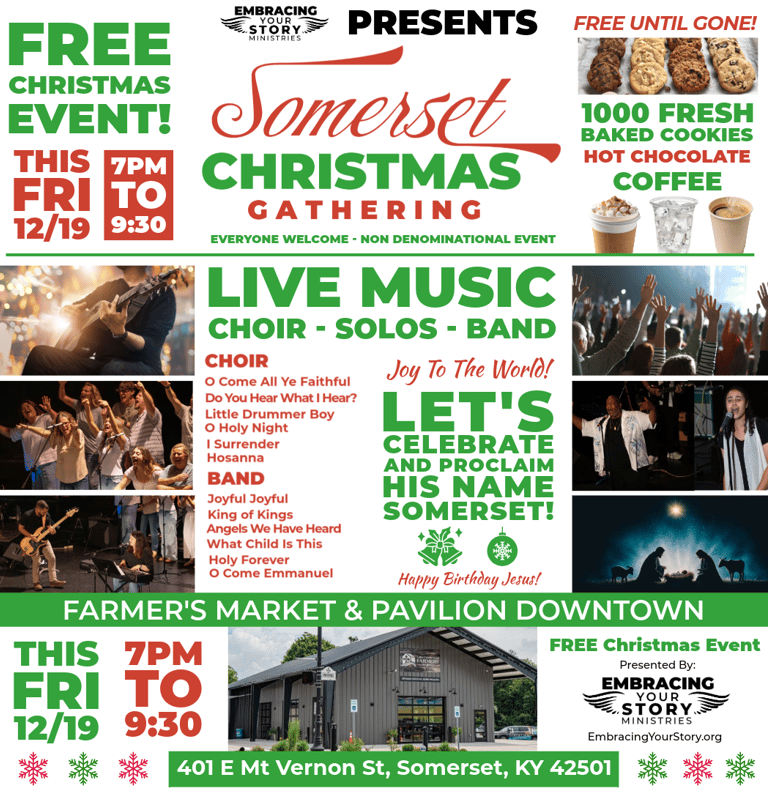 Join us this Friday December, 19th at 7:00PM at the Farmer's Market & Pavillion in downtown Somerset, KY! We will "Proclaim His Name" together!