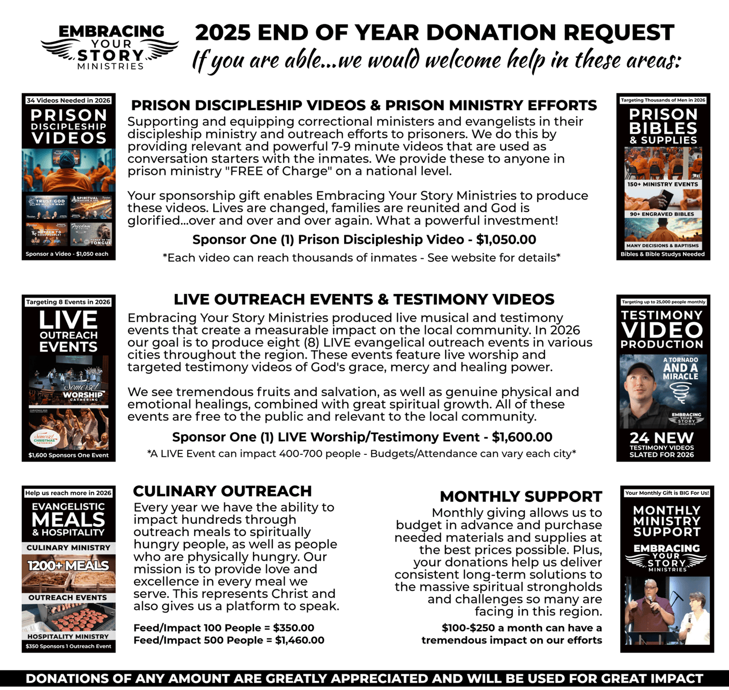 FINANCIAL - While we are fully confident that "Where HE guides...He provides"...we also understand that God loves unity and uses His kids to help support others in their callings. We are "all in" and your monthly support or one-time gift greatly helps us with the growing ministry requirements of Embracing Your Story Ministries. We honor your gifts and use them wisely! Thank you standing with us in carrying out the gospel.